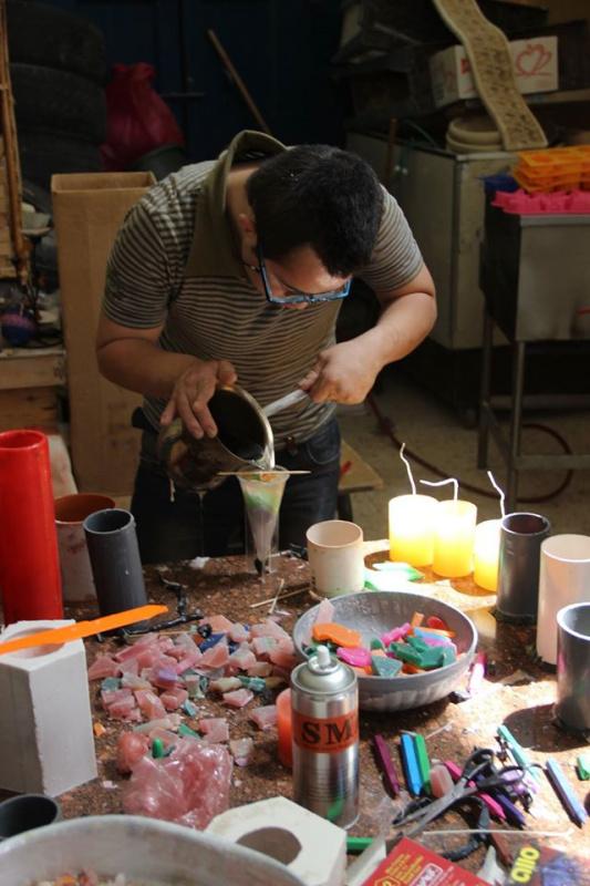 في مشغل الشموع بمركز الرجاء هناك خمسة طلاب من ذوي الاعاقة العقلية المتوسطة والبسيطة يعملون في مساحة تتسع لتفريغ طاقاتهم وحبهم بالشمع منذ عام 2003.