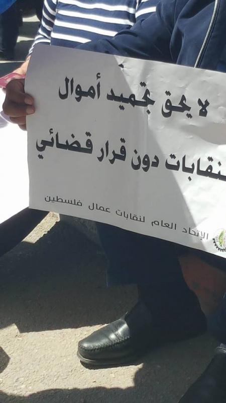 نظم اتحاد نقابات العمال صباح اليوم الثلاثاء، وقفة احتجاجية امام مقر المحكمة العليا برام الله، رفضا لقرار الحكومة بتجميد اموال الاتحاد، من ثم توجهوا لاكمال الاحتجاج امام مقر سلطة النقد.