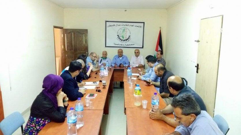 عقدت النقابة الوطنية للعاملين في المصارف والبنوك و الـتأمين إجتماعها الأول اليوم السبت 4.6.2016 وذلك في مقر الاتحاد العام لنقابات عمال فلسطين في مدينة رام الله بحضور الأمين العام لإتحاد نقابات عمال فلسطين السيد شاهر سعد والسيد حيدر ابراهيم الامين العام لاتحاد عمال فلسطين وكل من السيد حسين فقهاء والسيد باير سعيد اعضاء الامانة العامة للاتحاد والسيد إبراهيم دراغمه عضو اللجنة التنفيدية للاتحاد.