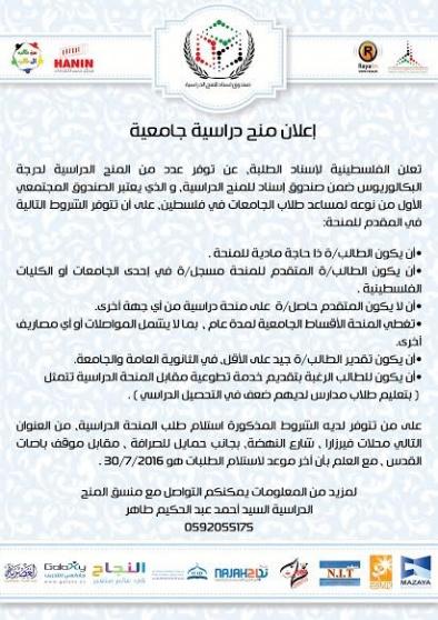 على من تتوفر لديه الشروط المذكورة استلام طلب المنحة الدراسية، من العنوان التالي محلات فيرزارا، شارع النهضة، بجانب حمايل للصرافة، مقابل موقف باصات القدس، مع العلم بأن أخر موعد لاستلام الطلبات هو 30/7/2016.