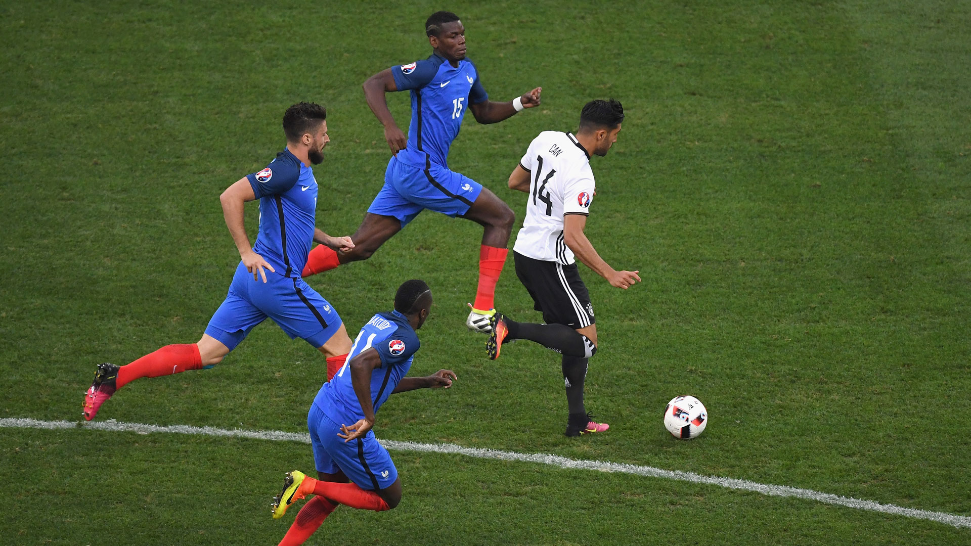 وعلى الجهة الأخرى، تلعب فرنسا على المرتدات، فلينطلق جريزمان وسط الدفاع الألماني قبل أن يسدد كرةً سهلةً في يد نوير قـ86، ثم يخرج الأول وسط تحيةٍ كبيرةٍ من جماهير الفيلودروم تاركاً مكانه للاعب الوسط المدافع يوهان كاباي قـ92، قبل دقيقةٍ واحدةٍ من فرصتين متتاليتين للضيوف من رأسية كيميخ التي تصدى لها لوريس ببراعةٍ منقطعة النظير قـ93، ثم رأسيةٍ أخرى من البديل جوتزه تمر بجوار القائم الأيسر البعيد لمرمى حارس الديوك، لنتهي المباراة بفوزٍ غالٍ لفرنسا على ألمانيا، تصعد على إثره لمواجهة رفاق كريستيانو رونالدو في نهائي مثير لليورو,