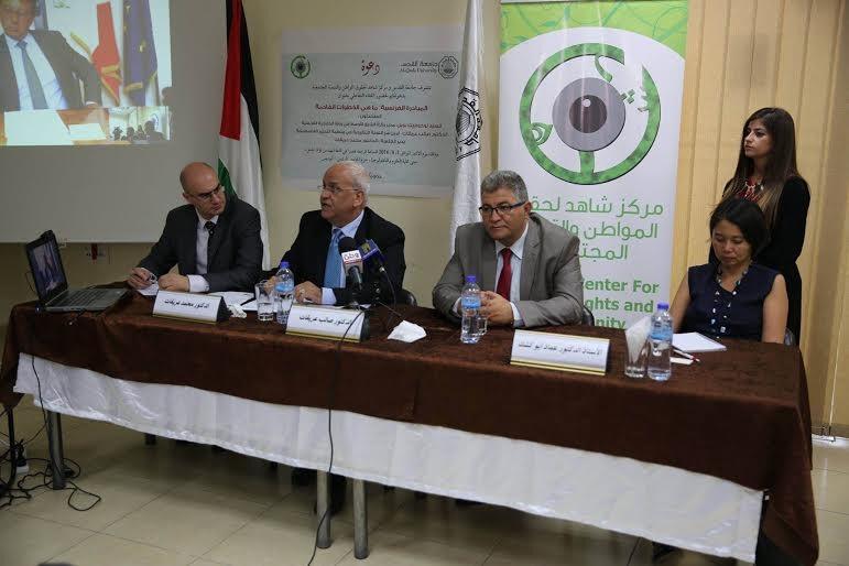 استضافت جامعة القدس لقاء سياسياً تفاعلياً، بالشراكة مع مركز شاهد لحقوق المواطن والتنمية المجتمعية، و تحدث فيه أمين سر اللجنة التنفيذية لمنظمة التحرير الفلسطينية د. صائب عريقات، ومدير وحدة الشرق الأوسط في الخارجية الفرنسية لوفدياك بويل، وبحضور رئيس الجامعة أ.د عماد أبو كشك ونوابه ومحاضرين فيها.