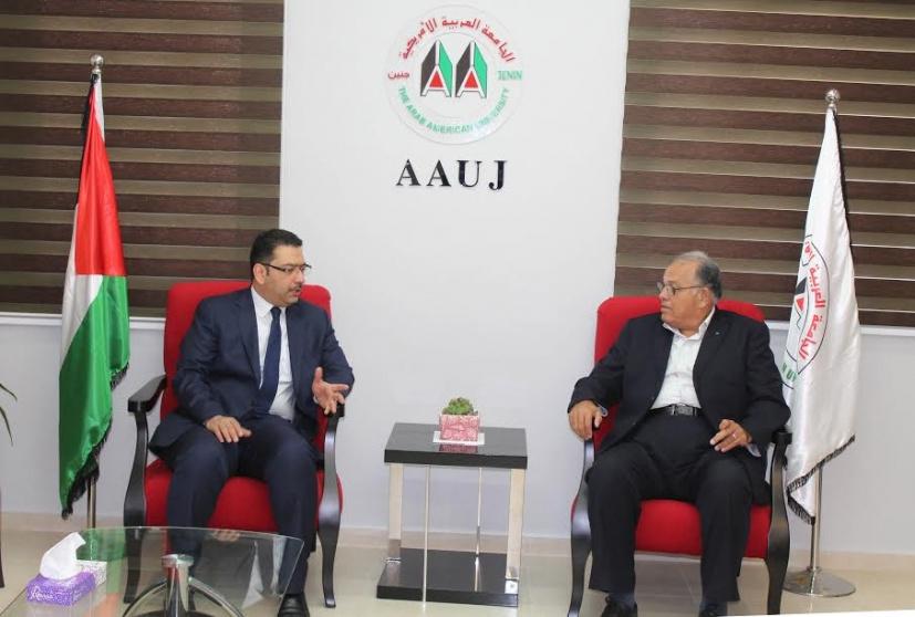 كما التقى عابد بمساعد رئيس الجامعة للشؤون الإدارية والمالية الأستاذ فالح أبو عرة الذي أشار الى ان الجامعة العربية الامريكية هي الجامعة الفلسطينية الأولى التي تهتم بالجانب الرياضي، ببناء منشآت رياضية بمواصفات عالمية، بهدف إيصال رسالة رياضية الى المجتمع المحلي والدولي، وخدمة للفكر الرياضي الحر.