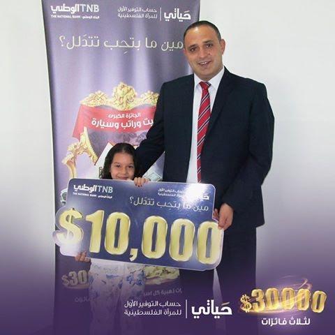 أعلن البنك الوطني نتائج السحب الثالث ضمن برنامج التوفير الأول للمرأة الفلسطينية "حياتي"، والذي تضمن السحب على جائزتي ال 10 آلاف دولار نقدا والليرات الذهبية، حيث فازت كل من الطفلة غادة الجعبري بولاية ابيها من فرع الخليل ب 10آلاف دولار نقدا، والطفلة ملك هندو بولاية أبيها ايضا من فرع الميدان بثلاث ليرات ذهبية.