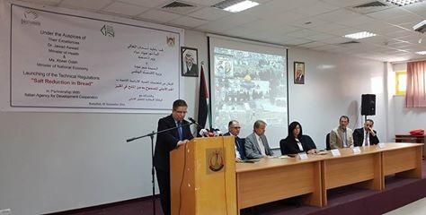 أعلن وزير الصحة د. جواد عواد ظهر اليوم عن السياسة الوطنية الفلسطينية بتخفيض نسبة الملح في الخبز، بحضور وزيرة الإقتصاد عبير عودة وممثلين عن منظمة التعاون الإيطالية ومنظمة الصحة العالمية، وذلك في مقر وزارة الصحة برام الله.