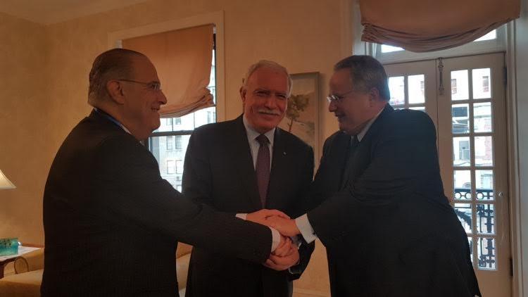 عقد وزراء خارجية دول فلسطين وقبرص واليونان الدكتور رياض المالكي والسيد ليوانيس كاسوليدس والسيد نيكوس كوتزياس اجتماع ثلاثي اليوم ، على هامش اجتماعات الجمعية العامة للامم المتحدة في نيويورك.