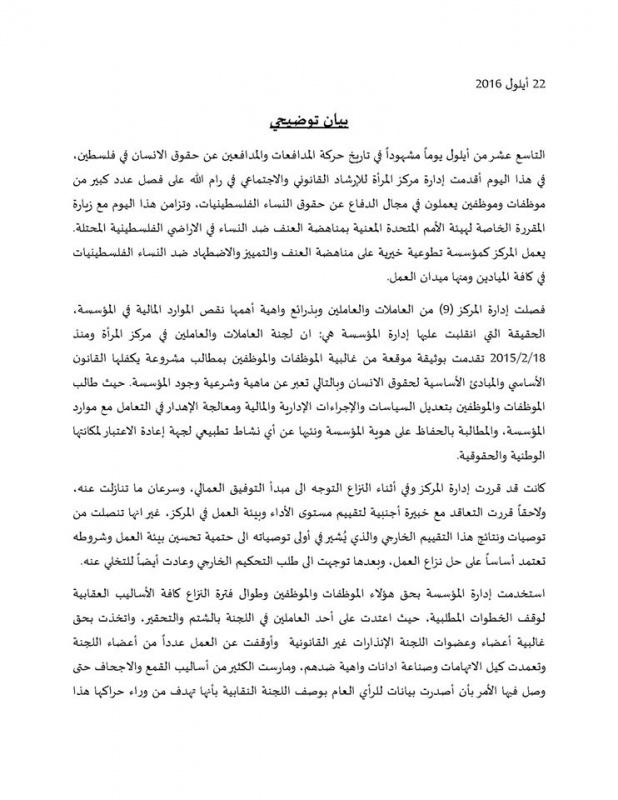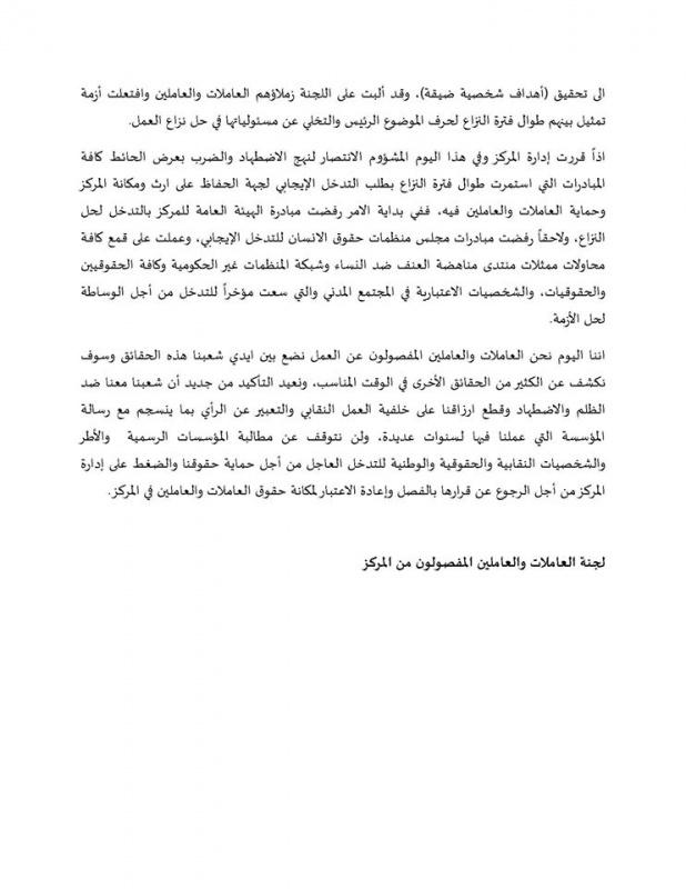 "مركز المرأة للإرشاد" يفصل 9 عاملين وعاملات.. واللجنة تتهمه بـ"التعسف"