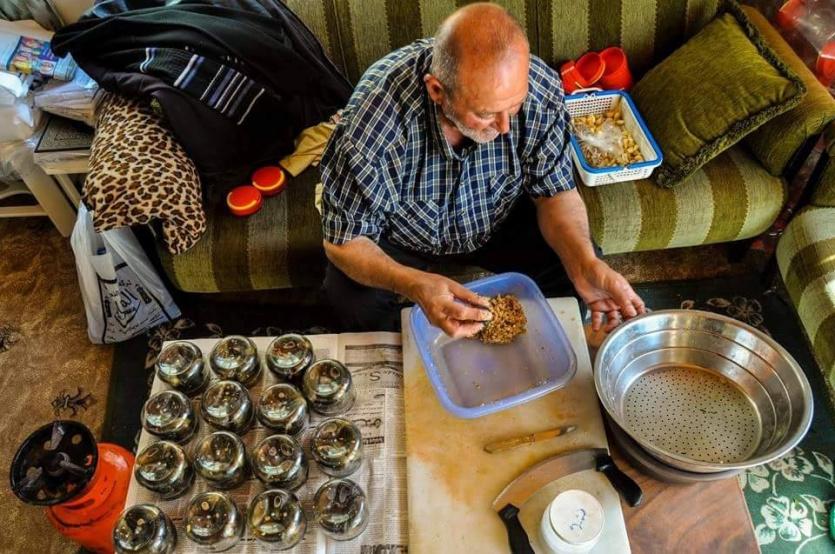 الحاج السبعيني عبد المجيد الروم أو كما يسمونه "ابو الديب" يتقن منذ سنتين صنع خلطة المقبلات هذه على افضل نحو، في مدينة تشهد في آن واحد نوعا من الحداثة والغلاء في الاطعمة حتى بات أهلها يتذمرون من اسعار مطاعمها ويقارنونها بمدن اوروبية.