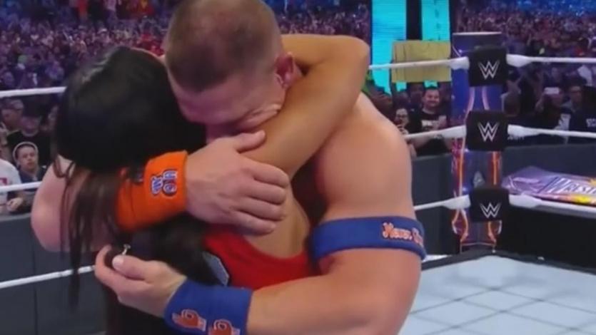 وجثا سينا على ركبتيه أمام الآلاف من الجماهير في حلبة المصارعة، بعد أن هزم رفقة بيلا، الثنائي ذا ميز وزوجته مارس في مواجهة مثيرة، الأحد، ومد إليها خاتما قائلا لها: هل تقبلين الزواج مني؟".