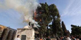شاهد: اندلاع حريق في أحد أشجار "الأقصى" بسبب اعتداءات الاحتلال